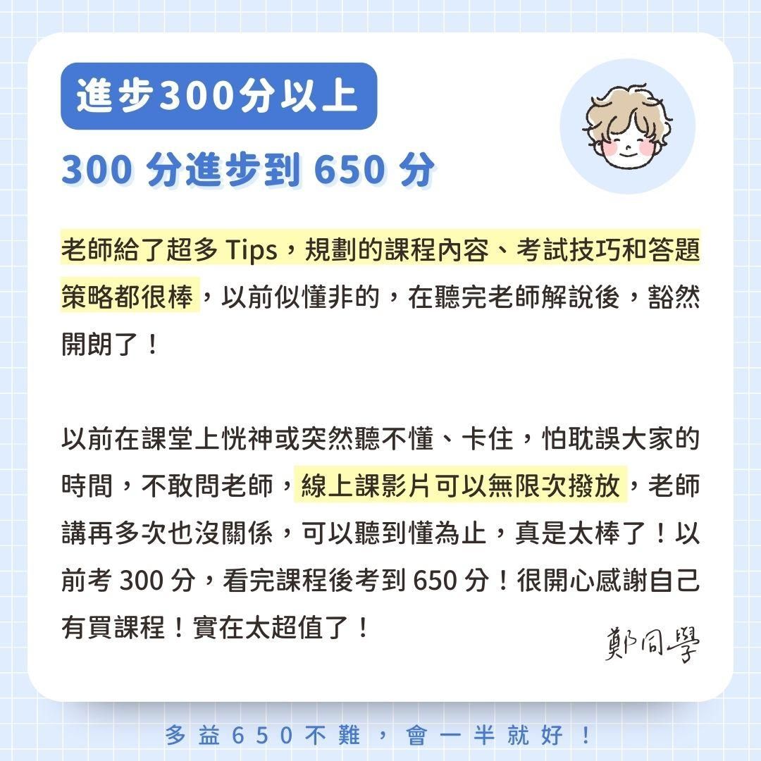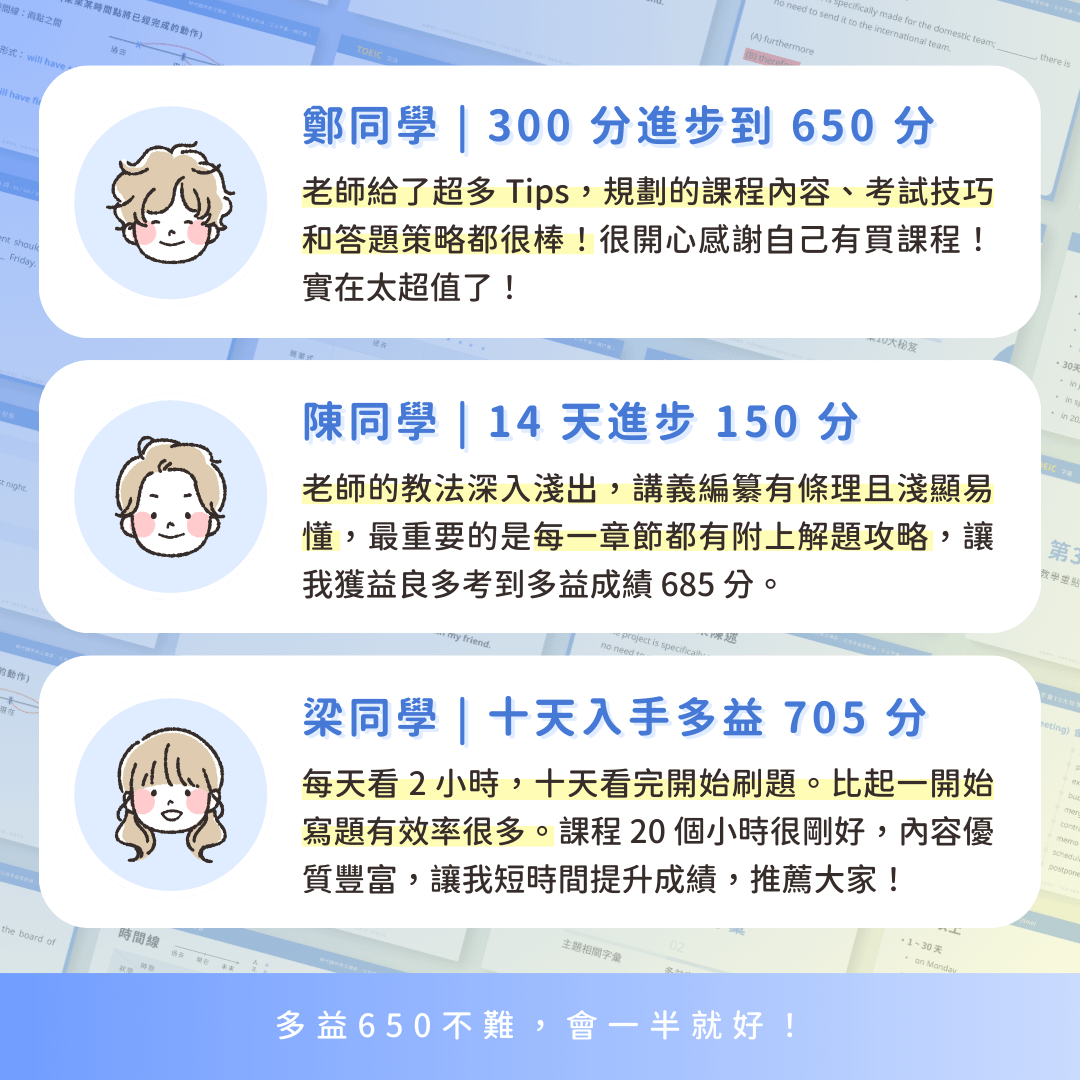 第一次考多益像無頭蒼蠅般的解題,導致我只考500多分。後來跟著老師學許多背單字技巧、分析題目的方法再加上模擬考,讓我更有自信地去面對多益考試。聽力遇到場景題時,抓住關鍵字就能輕鬆找出答案;老師教的閱讀技巧則可以迅速抓住題目要旨並快速理解文章。