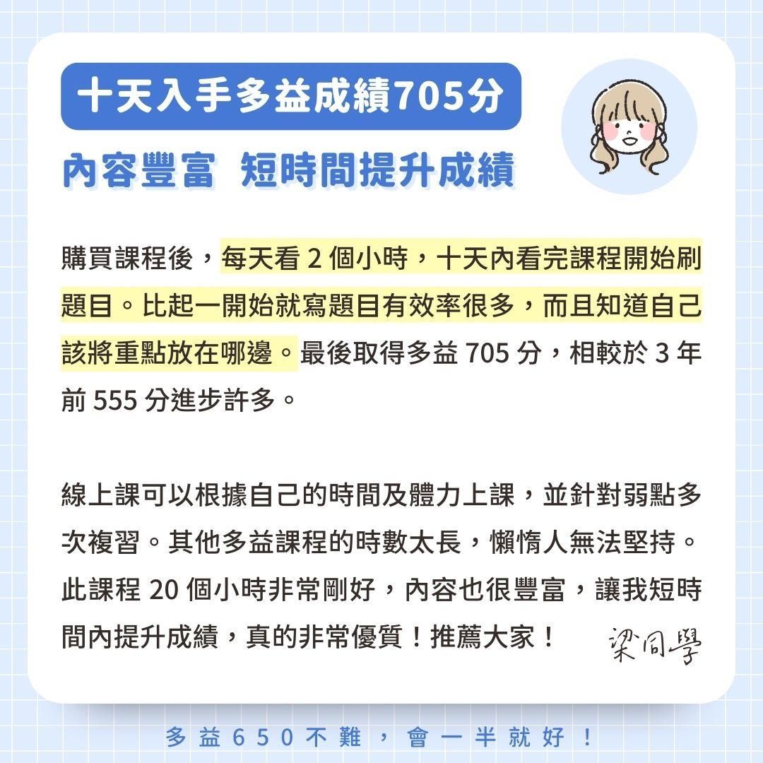 跟著老師學習一段時間後,我不僅增加了單字量、習得多益解題技巧,最後成功在多益考試中獲得金色證書的佳績。學習英文並不困難,重要的是要找到適合自己的學習方式。