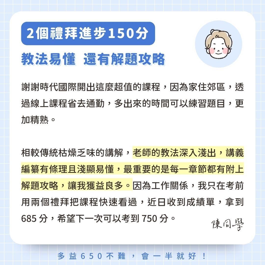 決定畢業後報考機師,所以想加強英文能力取得合格的多益成績。隨著老師淺顯易懂的文法課程、有系統的單字補充,讓我短時間內恢復且擴充了英文能力。聽力抓關鍵字盡早融入問題的場景,能更快掌握重點。閱讀的技巧可以更容易抓到問題並更快的看完文章。時代國際提供的模擬考,讓我能測驗自己的程度和熟悉考試狀況。